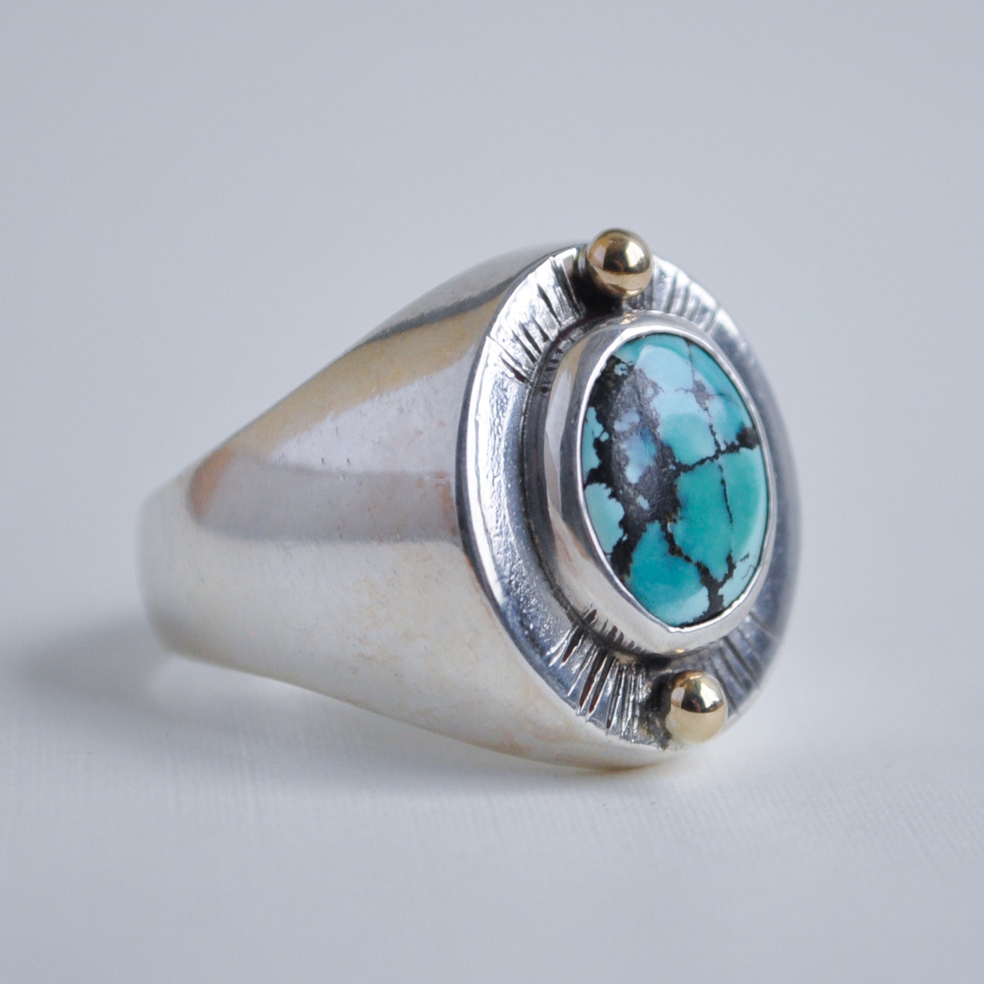 Part of the Dreamscape collection, this one of a kind amulet statement ring is set in sterling silver with an oval turquoise gemstone and north-south 14k yellow gold beads. This lofted signet style ring is lightweight and great for daily wear.